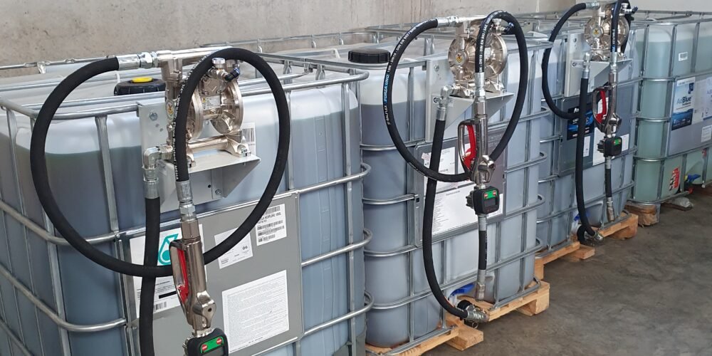 Detalle de equipamiento para aceitesBombas membrana 3/4″ 70 litros/minutoPistolas gran caudal 3/4″ boquilla 35mmAspiración inferior camlock 1″ Detalle equipamiento para AdBlueBomba eléctrica a 220v., pistola automática de suministro y cuenta litros digital