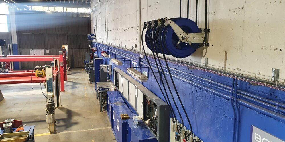 Detalle de equipamientoInstalación línea aire comprimido 32mm y bajantes en 20mmEnchufes alto caudal DN12Enrolladores manguera 1/2″ longitud 25 metros