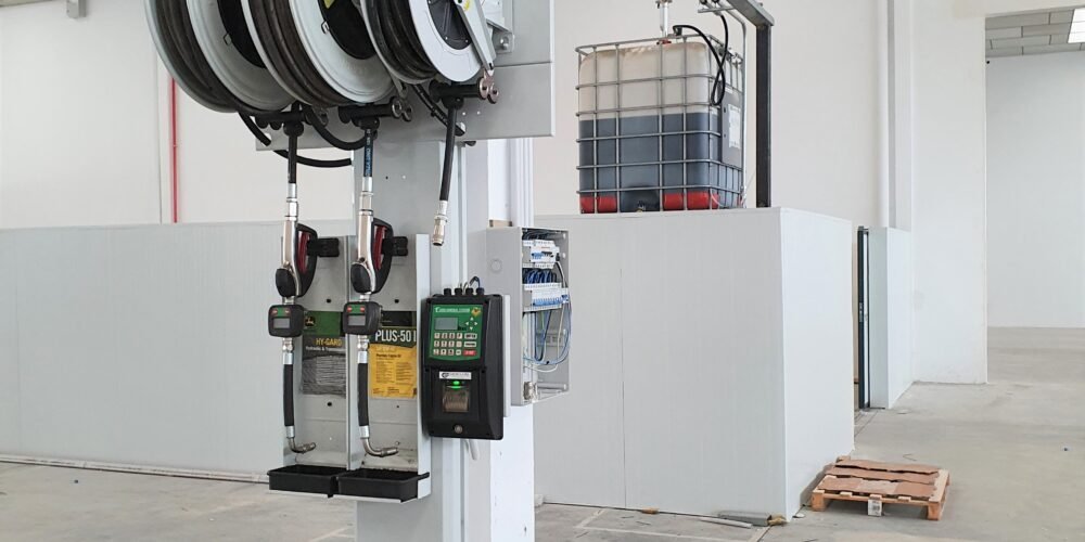 Detalle de equipamiento aceites nuevosBombas Raasm S650 ratio 5:1 doble efectoEnrolladores Raasm S530 mangueras 25 metrosPistolas Raasm medio caudal boquilla de 21mmDisplay en pared para visualización de litros suministradosControl informatizado de acceso operarios a suministros Detalle equipamiento aire comprimidoEnrolladores Raasm aire comprimido y mangueras 20mInstalación línea aire comprimido 32mm yRead More