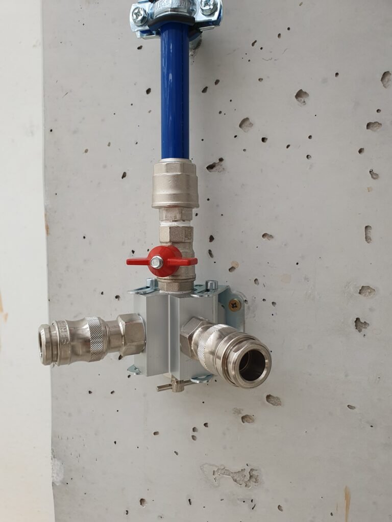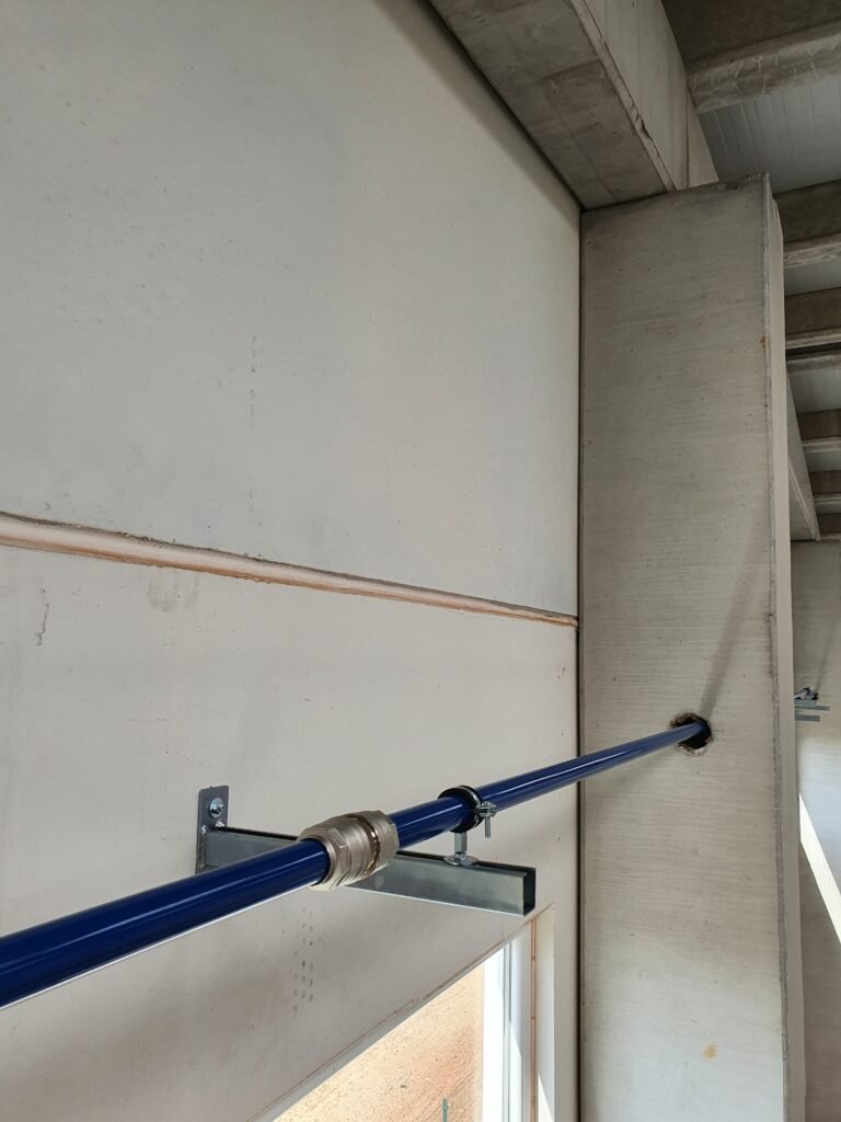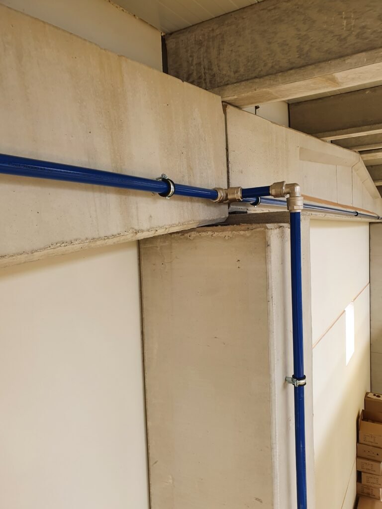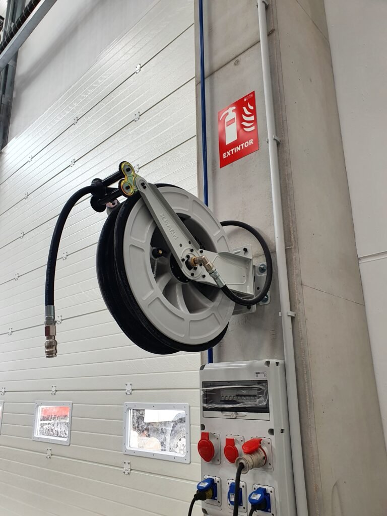 Detalle de equipamiento Instalación línea aire comprimido 32mm y bajantes en 20mm Enchufes alto caudal DN12 Enrolladores manguera 1/2″ longitud 25 metros